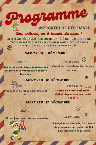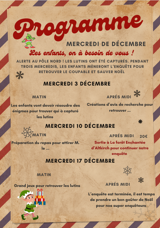 Pendant trois mercredis, ils se transformeront en véritables détectives : énigmes 🔍, bricolages 🎨, défis 🎯 et même une sortie au marché de Noël d’Altkirch 🎅🎁 pour poursuivre leur enquête magique.